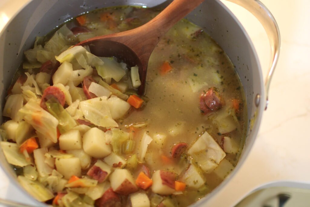 4. Stir in the potatoes, carrots, celery, and cabbage. Pour in the chicken broth. If it doesn’t cover the vegetables, you may need to add more broth or water. Boil until tender, about 20 minutes.