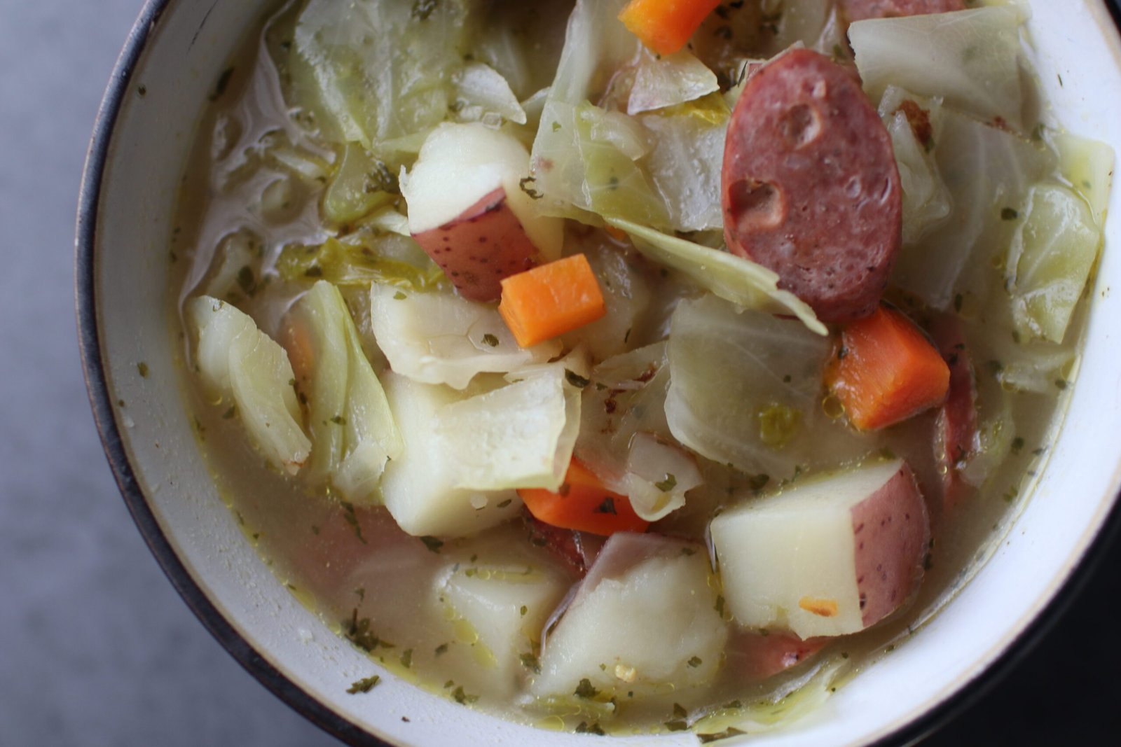 A hearty sausage and cabbage stew made with potatoes, simple vegetables, and broth. Affordable, filling, and easy to adapt to what you have.