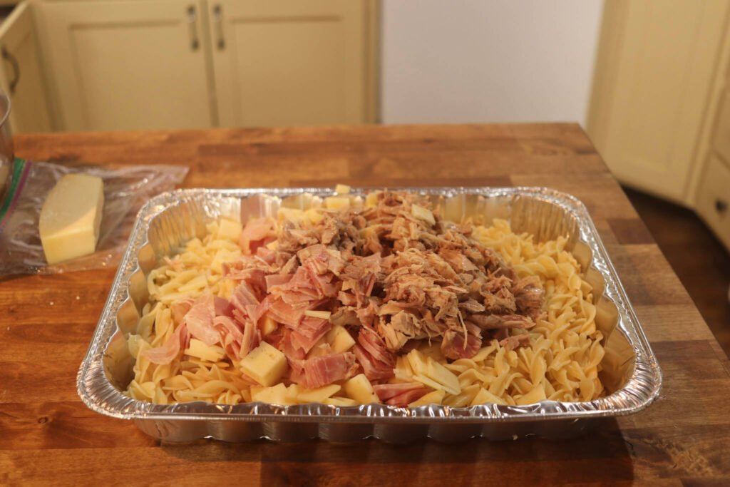Add the cooked noodles, chicken, ham, and cheese directly to the baking dish. Gently toss to distribute everything evenly.