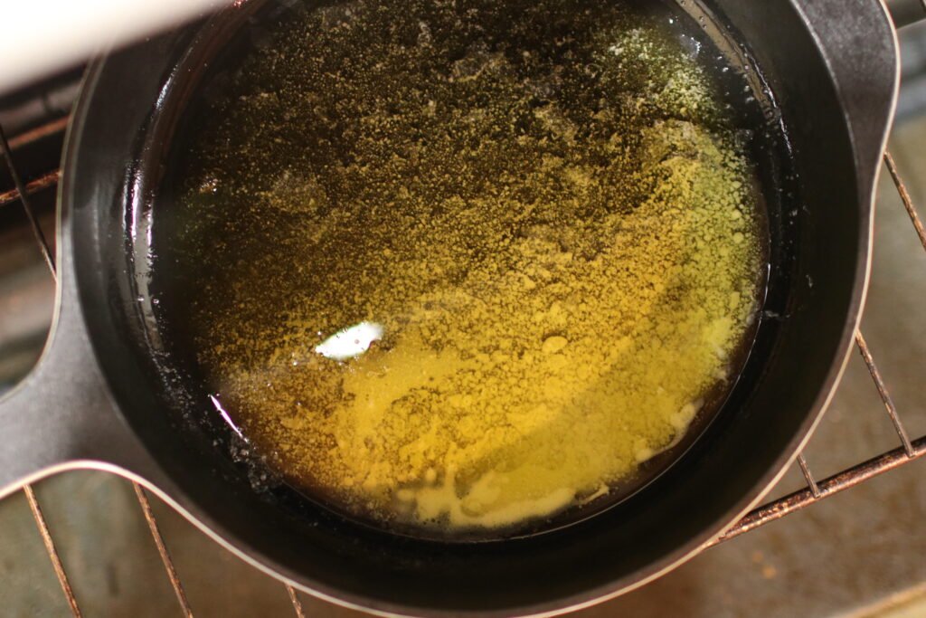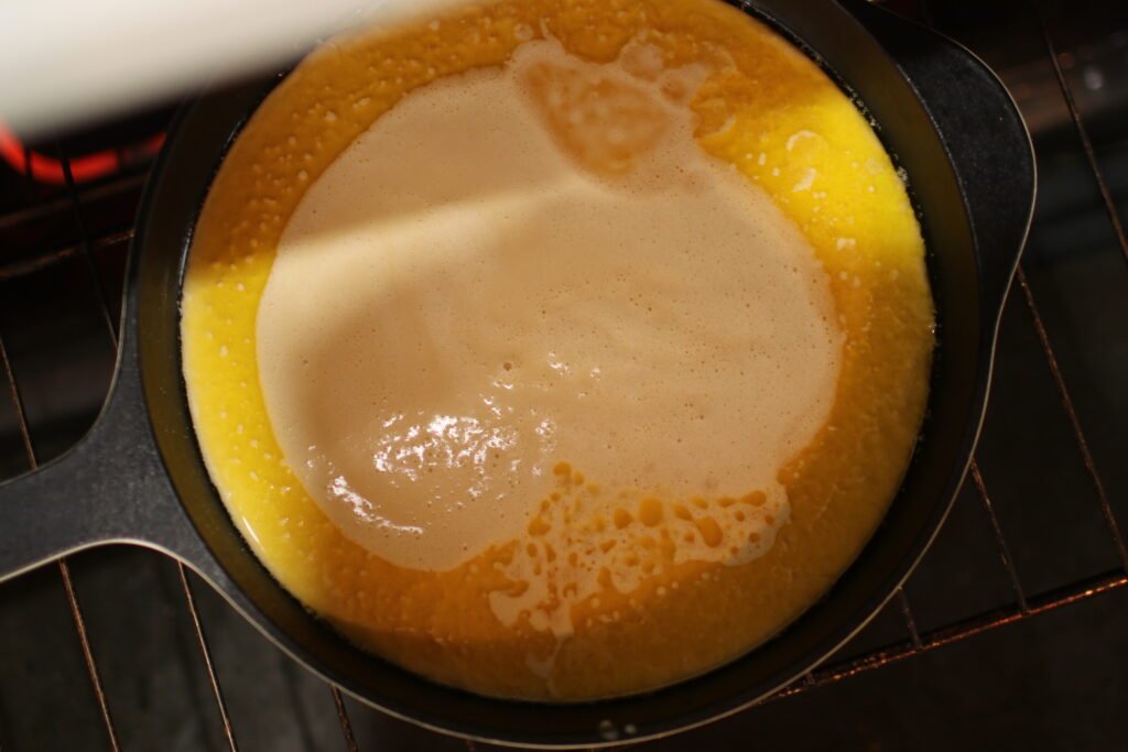 Add the butter to the hot pan and return it to the oven while you prepare the batter, allowing the butter to fully melt.