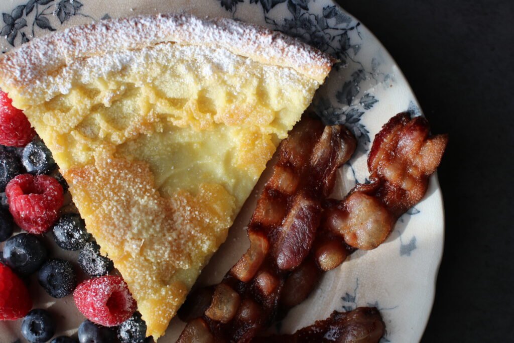 Serve immediately. The pancake will deflate as it cools — this is normal. We like to eat this sprinkled with powdered sugar and berries.