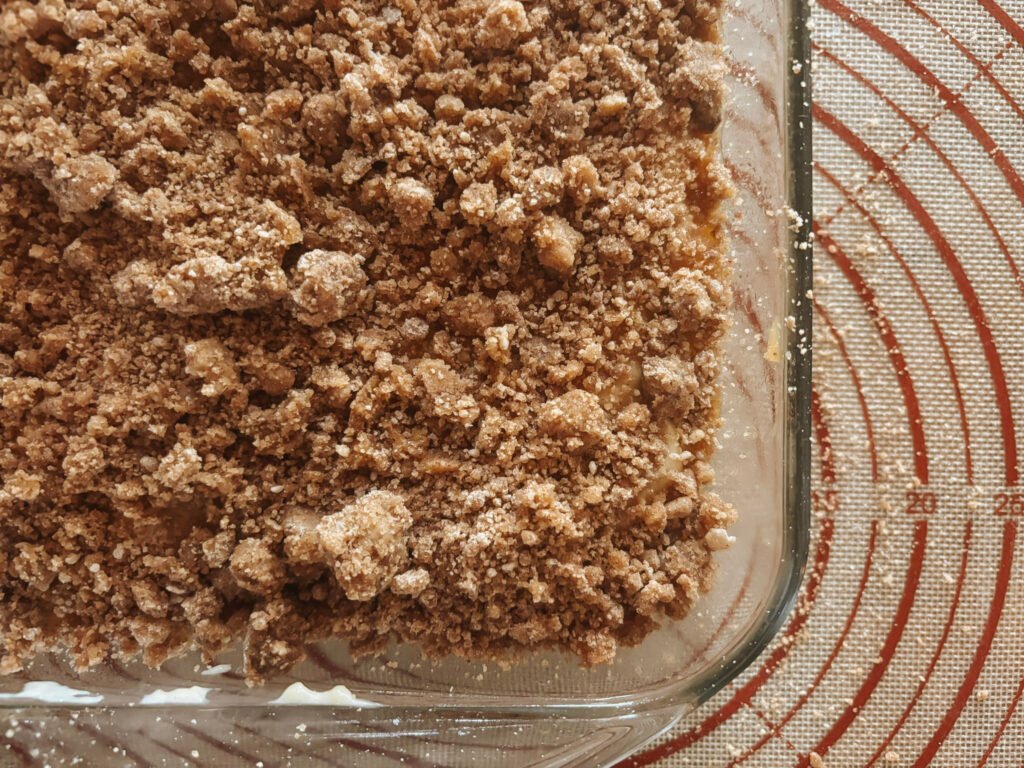 Sprinkle the streusel evenly over the batter. Using your finger or the small end of a wooden spoon, gently press the streusel halfway down into the batter, randomly