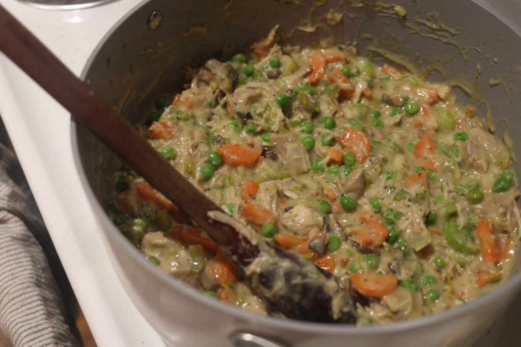 Chicken pot pie has always been a favorite for us—something both Matt and I grew up with here in PA Dutch country. We usually lean toward the soup version, but this filling still earns its place at the table. It’s familiar, comforting, and practical, with the kind of flavor that feels right whether it’s tucked into a crust, spooned over potatoes, eaten with biscuits and perfect for the freezer. I love a good versatile recipe, and this one is just that. You can use whatever veggies you have on hand and serve it however the heart desires.