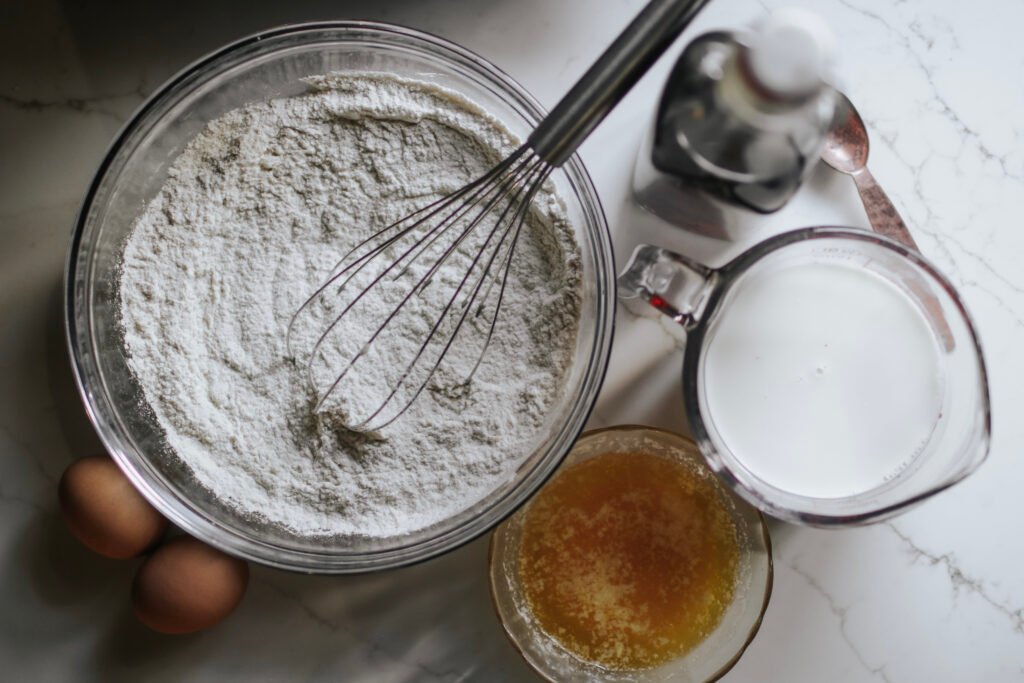 3. In a separate bowl mix together, eggs, warm milk, melted butter and vanilla.